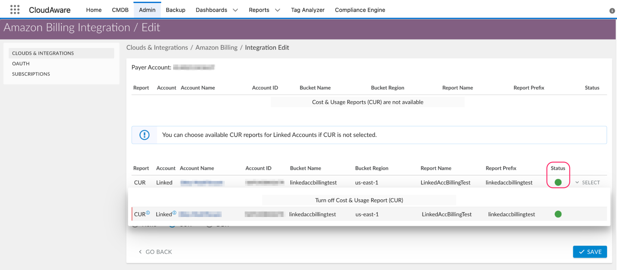 4. Go back to Cloudaware Admin → Amazon Billing. Select the Linked Account CUR report from the list. Ensure that the integration has a green status.