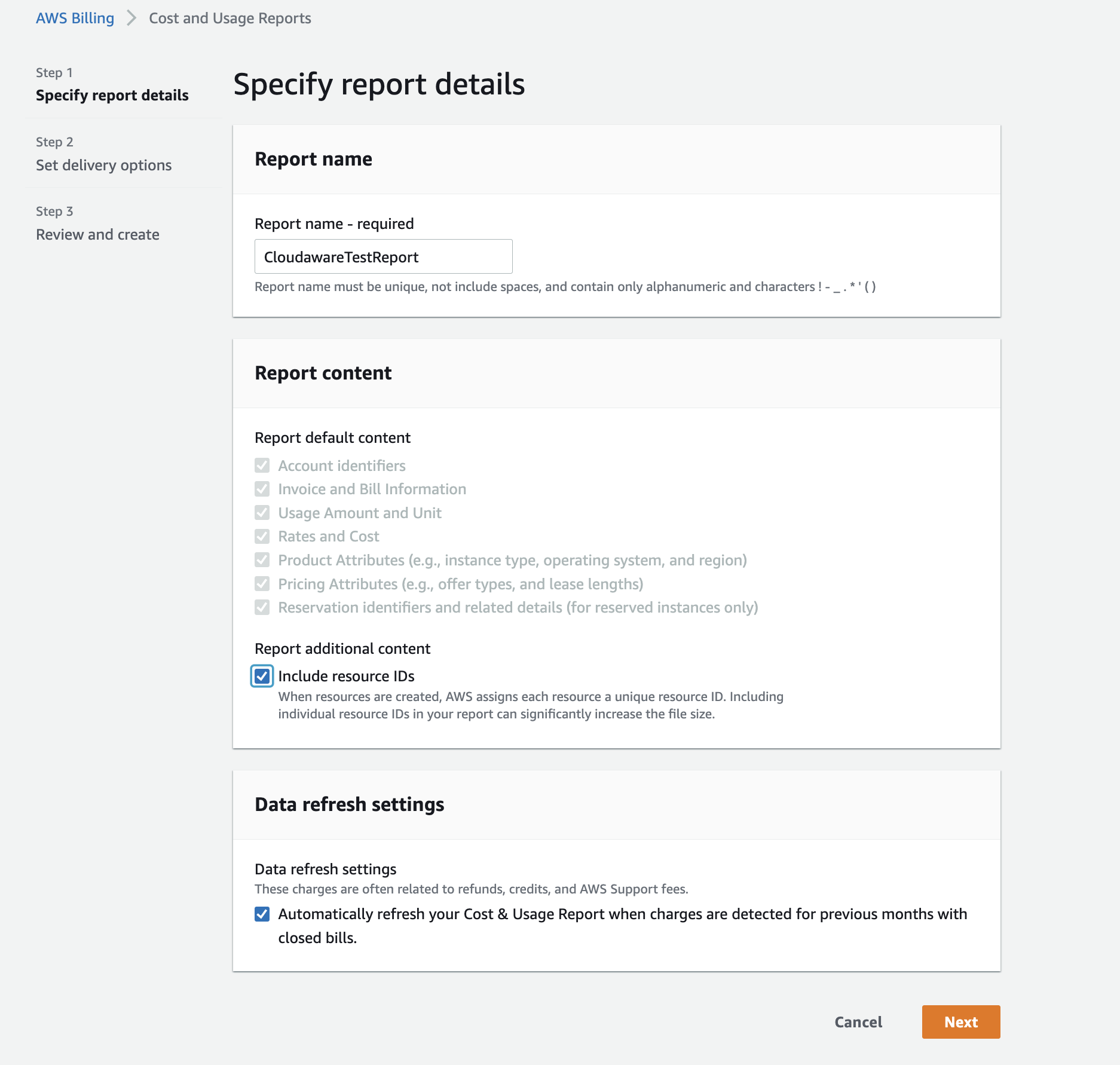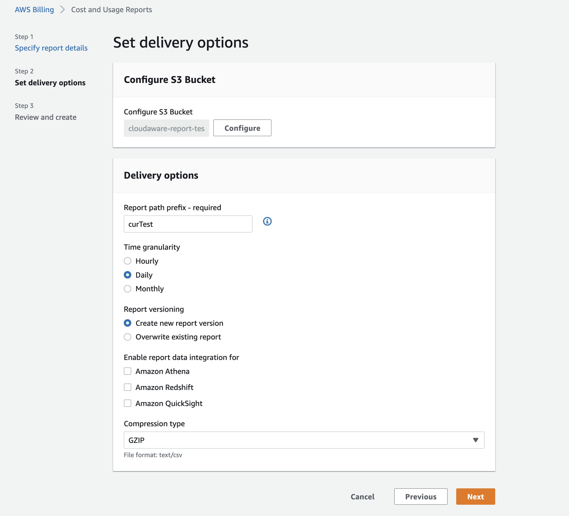 1. Enable Cost and Usage Report for a linked account in Amazon Console. Go to Services → Billing → Cost & Usage Report → Create Report: