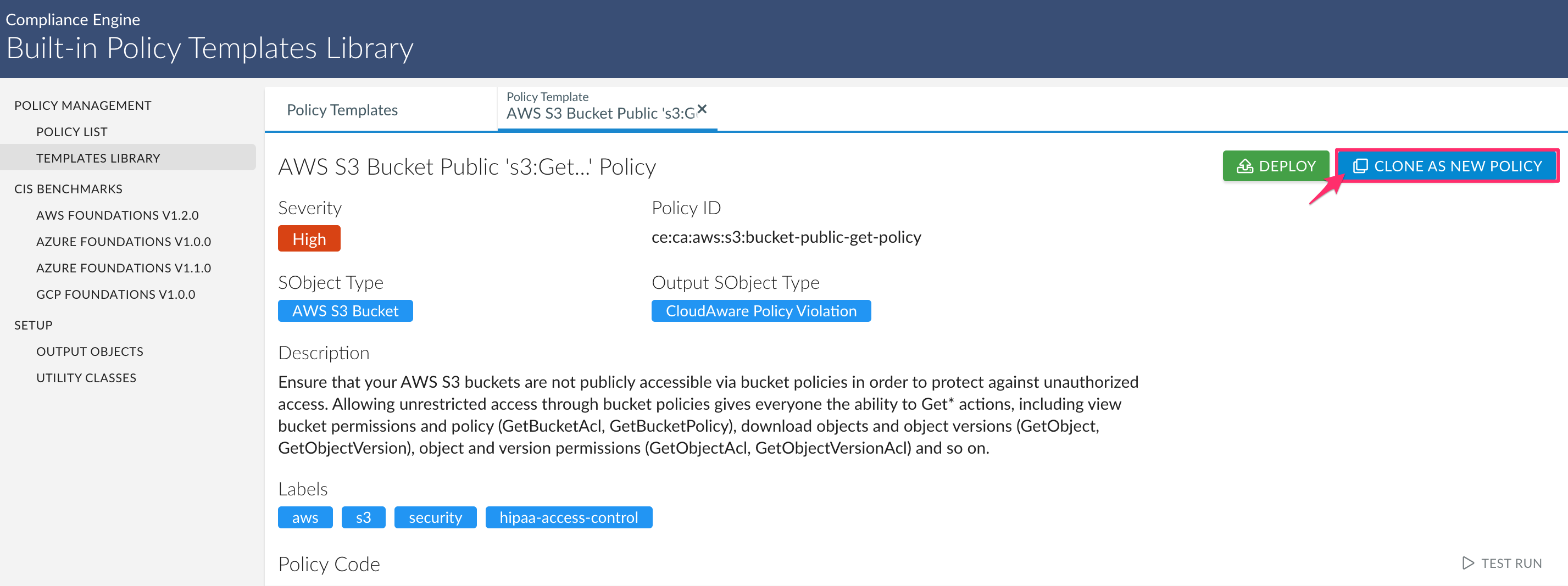 1. In the section TEMPLATES LIBRARY locate and open a policy template. Click Clone as New Policy.