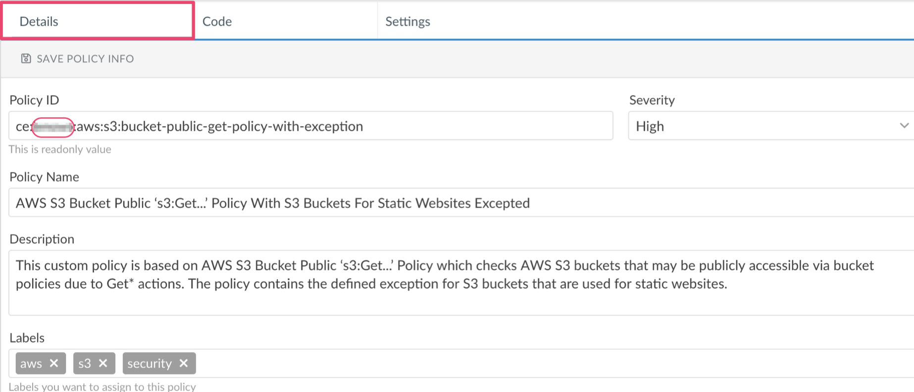 2. Review the policy details: modify the policy name, description, severity and labels (tags) if necessary. Pay attention to the naming convention (see the description below)! Click Create.