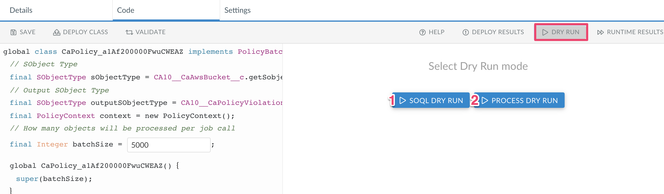 4. Click Dry Run and launch 'SOQL Dry Run' (1) and 'Process Dry Run' (2) to search for errors in your policy code.