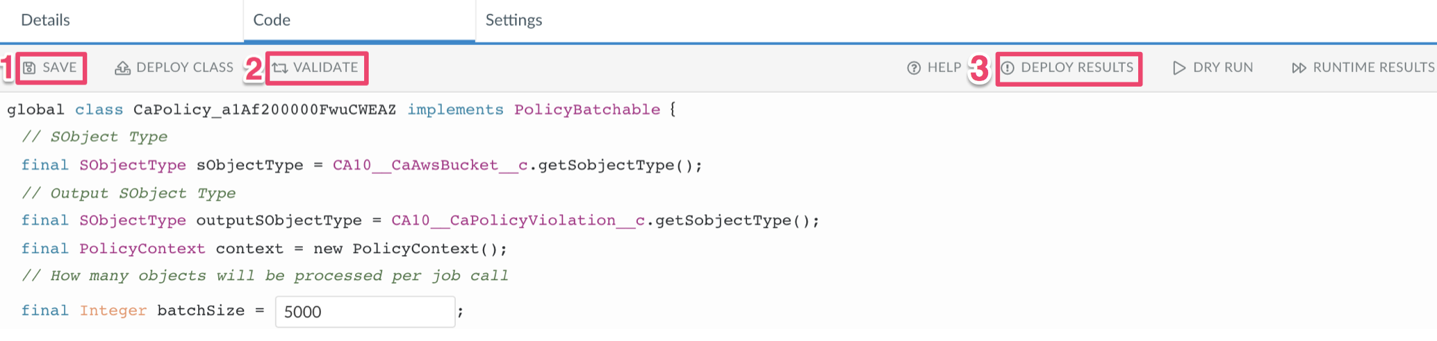 5. If no errors are found, click Save (1) → Validate (2). Click the tab 'Deploy Results'(3) to review policy deployment results.