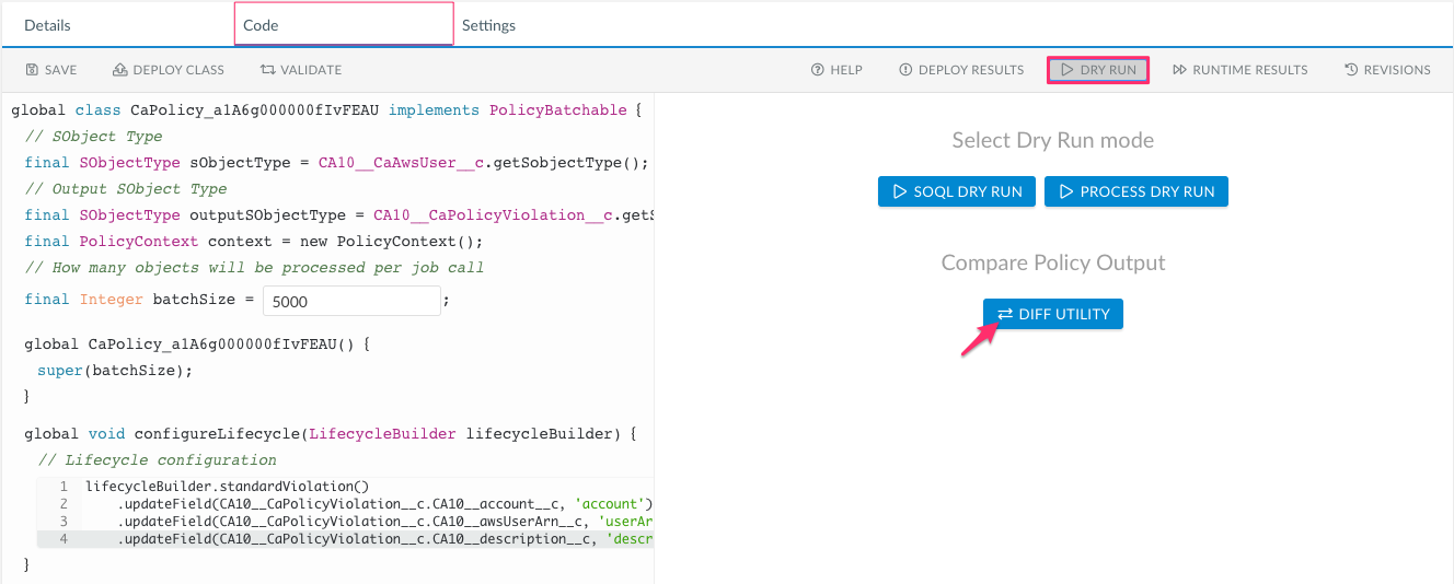 3. Click Dry Run → Diff Utility under 'Compare Policy Output'.