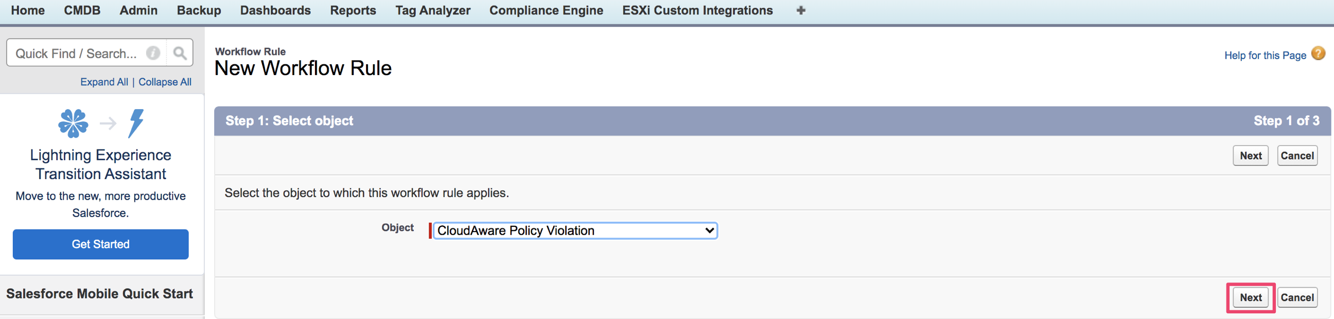3. Select the object, e.g. CloudAware Policy Violation. Click Next.