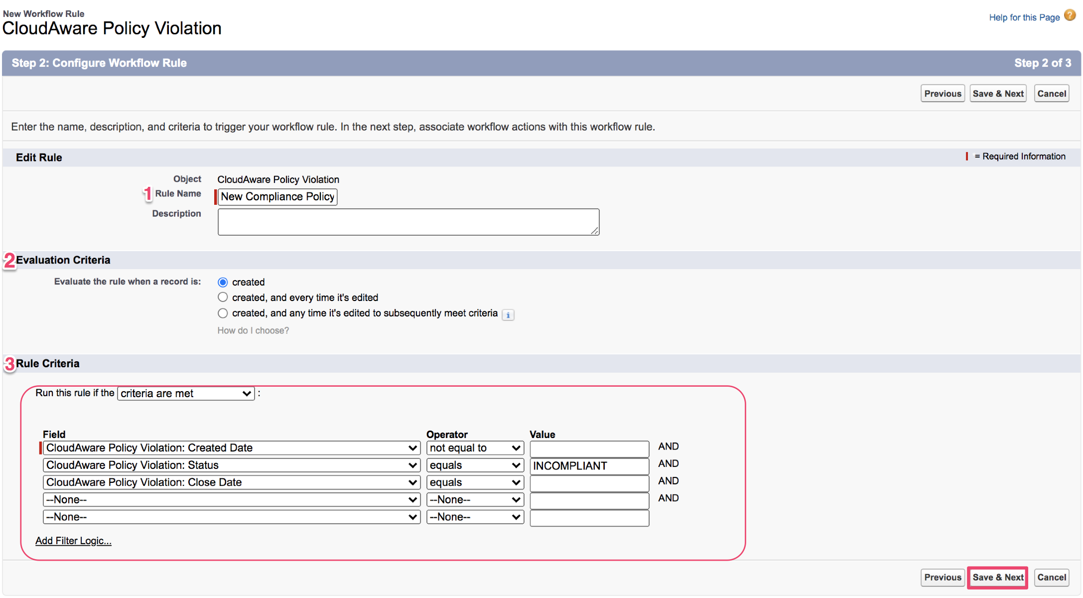 4. Add Rule Name (1), set Evaluation Criteria(2) and Rule Criteria(3). Add Filter Logic if necessary. Click Save & Next.