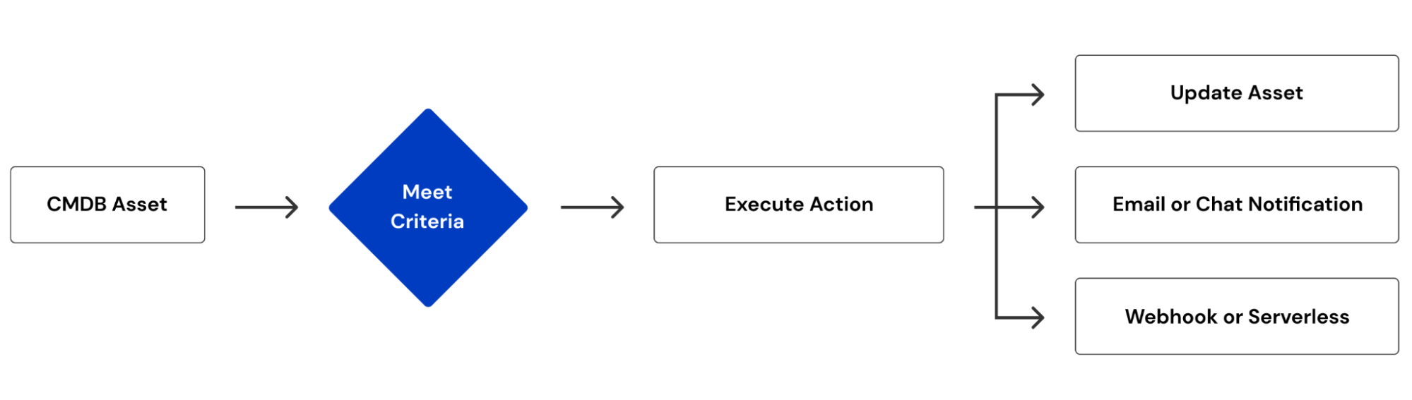 Flows consist of entry criteria and actions. Entry criteria is a specific configuration state of an entity in CMDB. Action is the process an operator would like to initiate once entry criteria have been met.