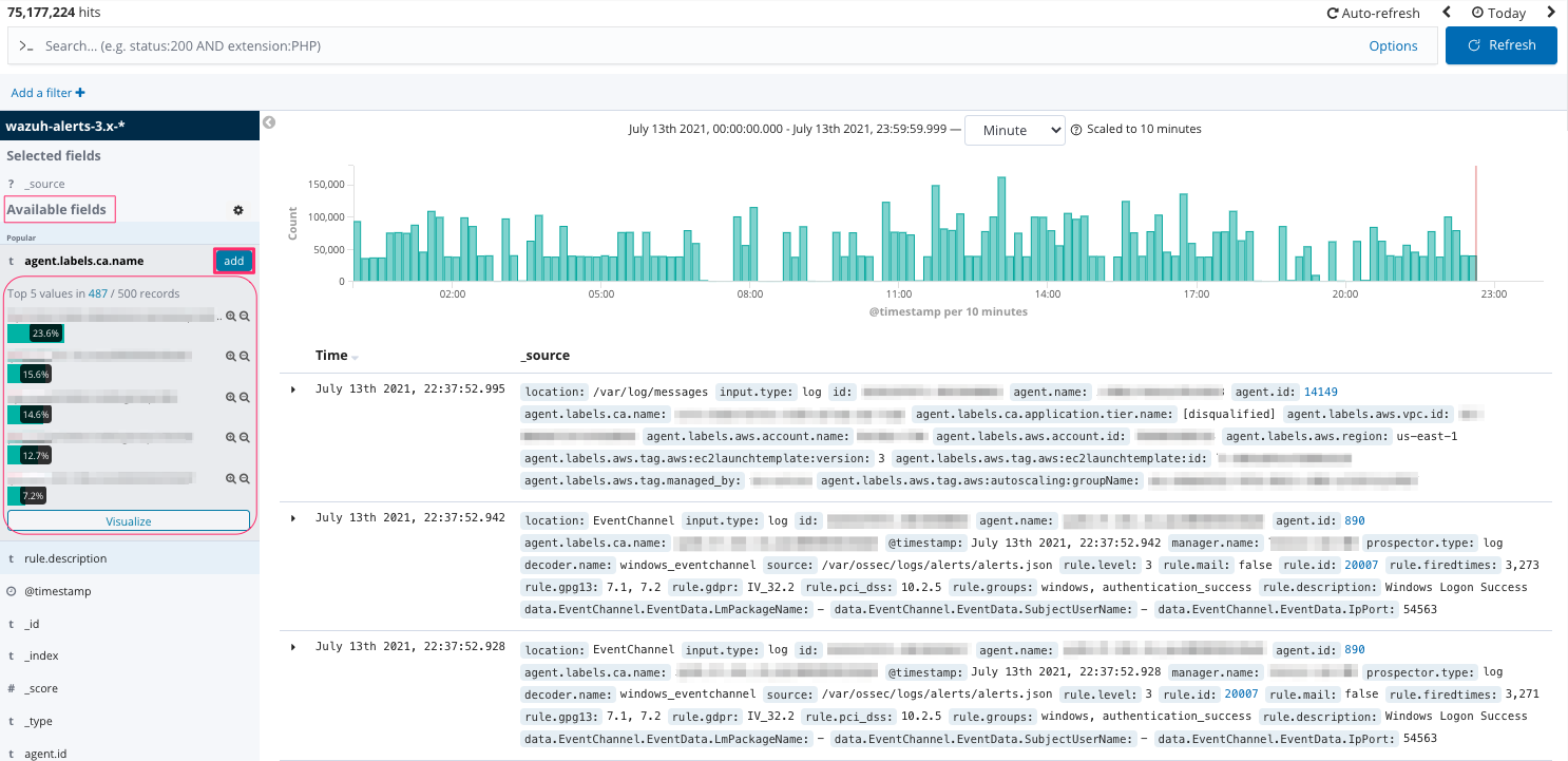 Refer to the list of available fields on the left. Click on a field to expand details about its top-5 values. Click Add to add the field as a column into the log display table on the right to analyze data: