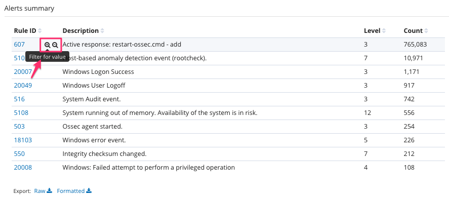 3. Hover mouse to the values in the table charts to locate 'zoom in' and 'zoom out' icons. For example, click 'zoom in' near a rule ID to view all related events: