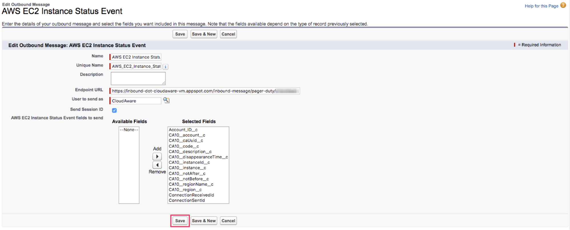 6. Fill out your Outbound Message details. Paste the URL copied earlier (https://inbound-dot-cloudaware-vm.appspot.com/inbound-message/pager-duty/{key}) in Endpoint URL.