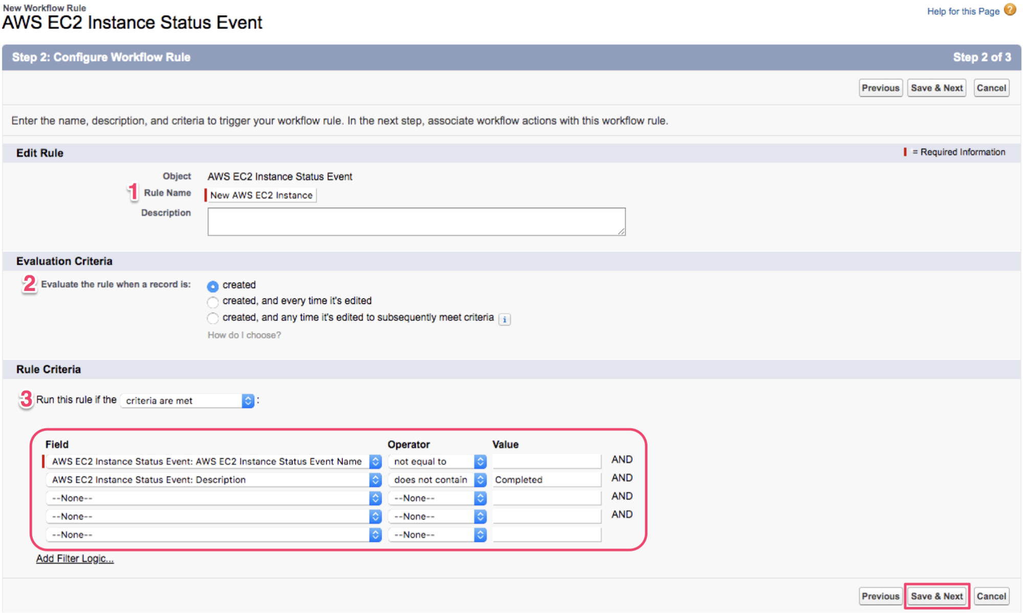 4. Add Rule Name (1), set Evaluation Criteria(2) and Rule Criteria(3). Add Filter Logic if necessary. Click Save & Next.