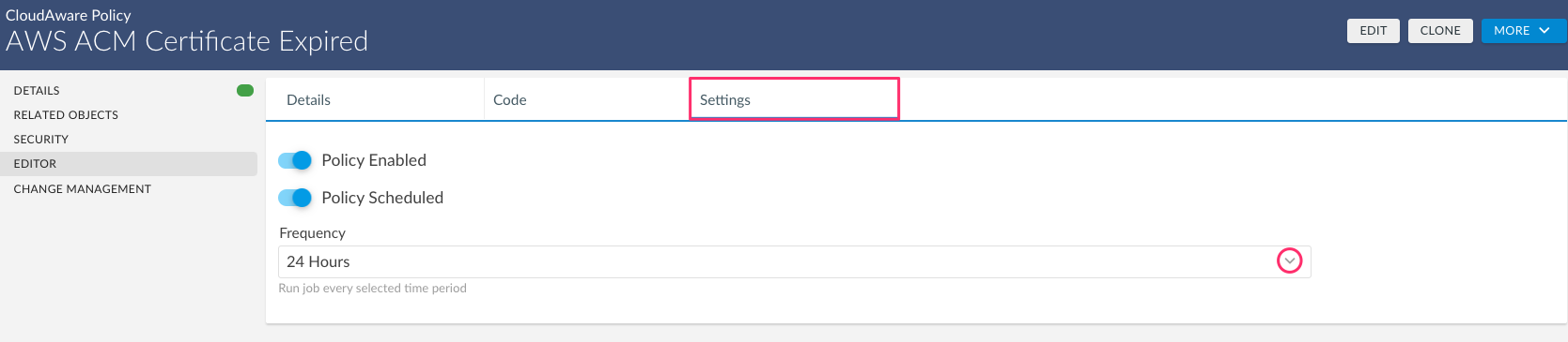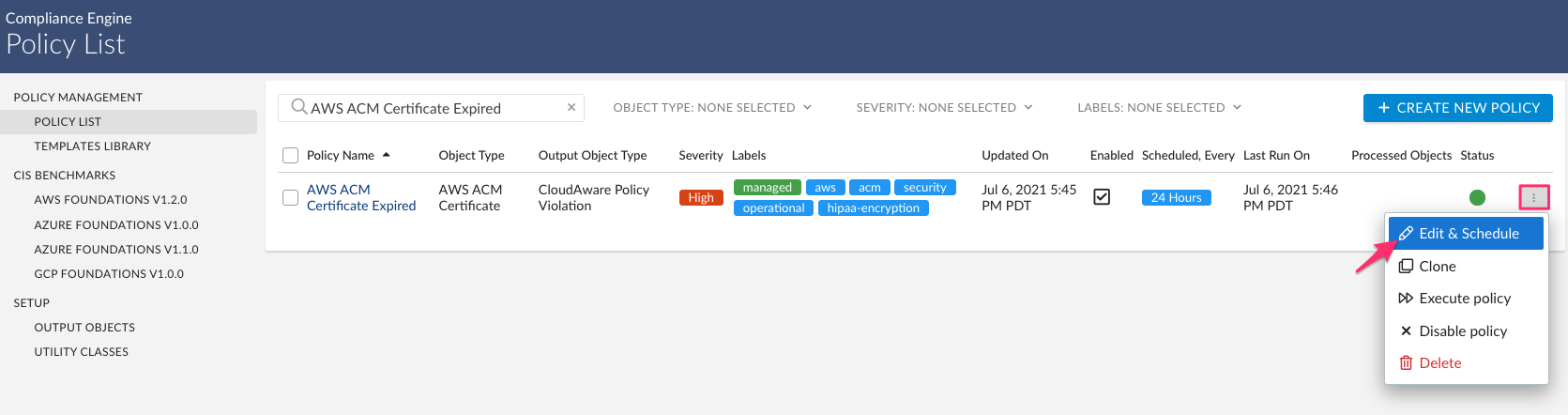 1. Locate the newly deployed policy in the list under the section POLICY LIST. Click triple dots on the right and select 'Edit & Schedule' to open the policy editor:
