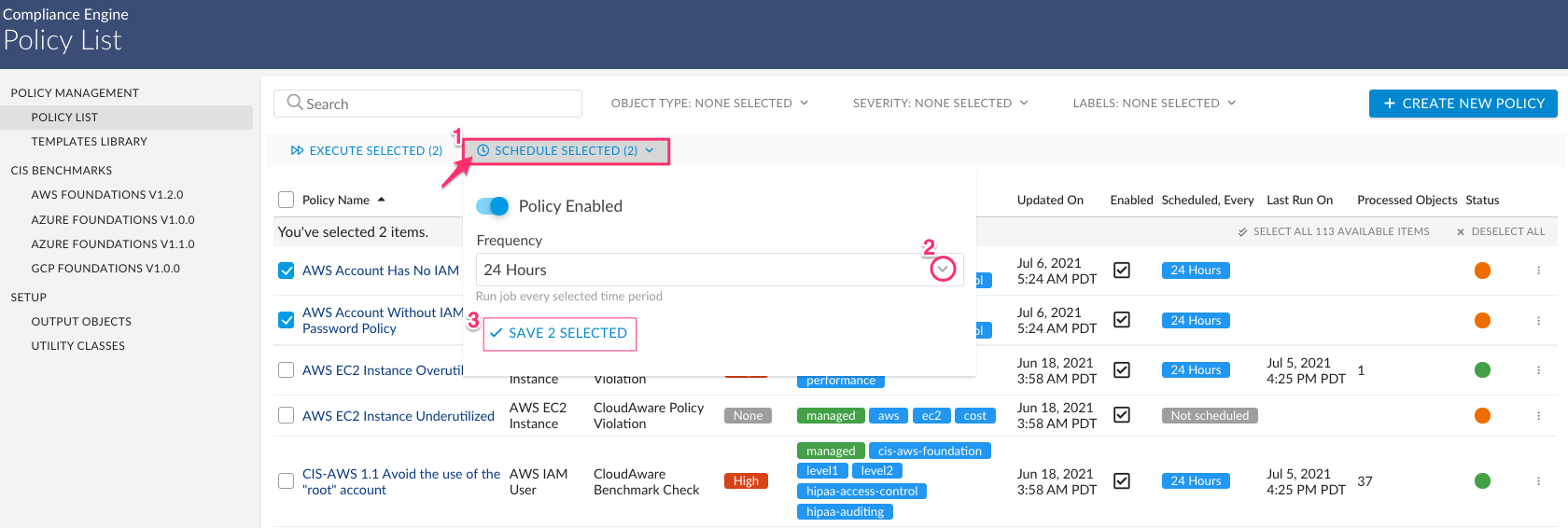 To schedule several policies at a time, check the boxes near the policies in question. Click Schedule Selected (1) that appears above, select the preferable frequency(2) and click Save Selected(3):