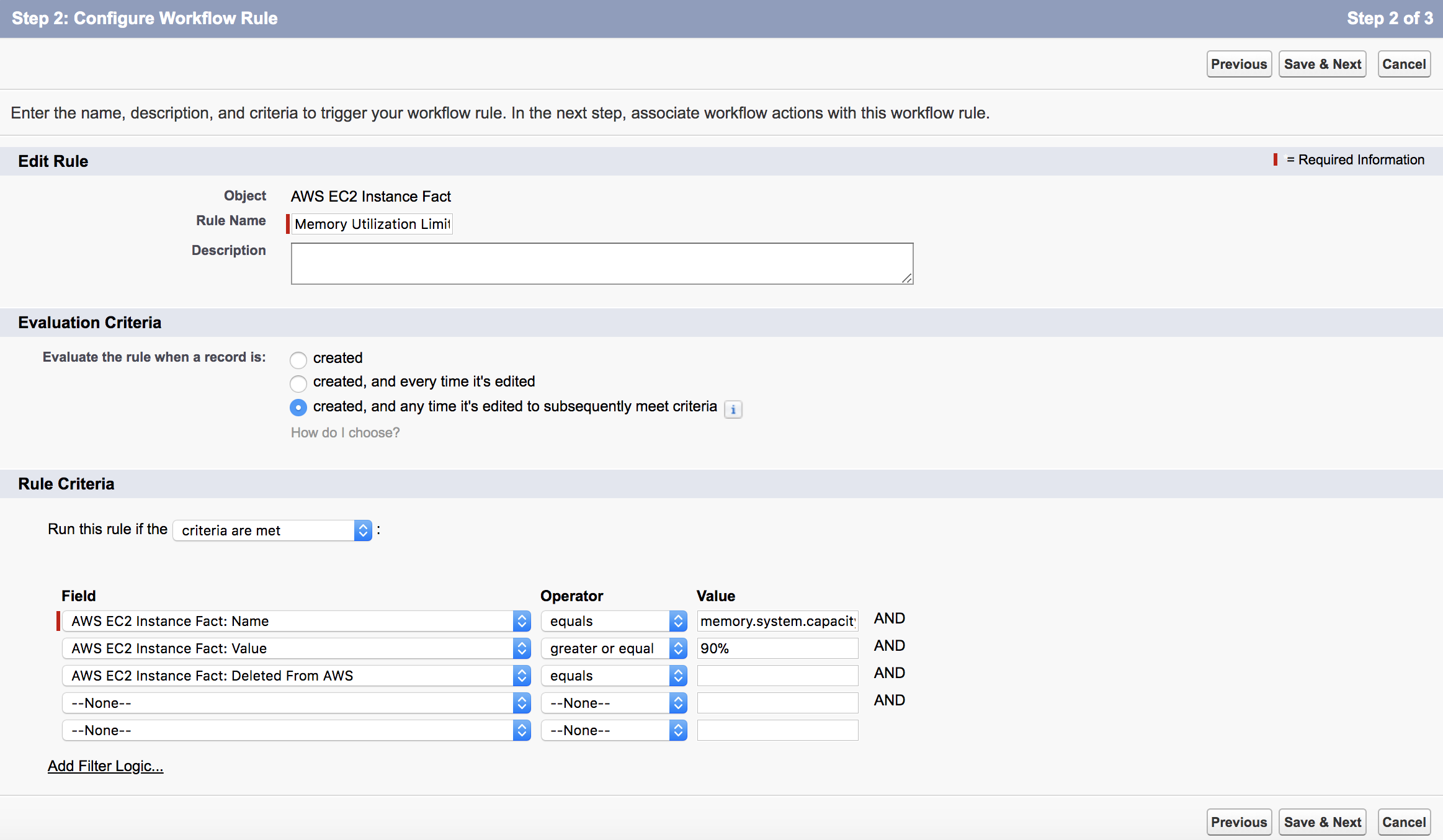 3. Set Rule Name. Add Rule Name, set Evaluation Criteria and Rule Criteria. In this example, we consider the memory capacity greater or equal to 90% as a critical condition. Click Save & Next.