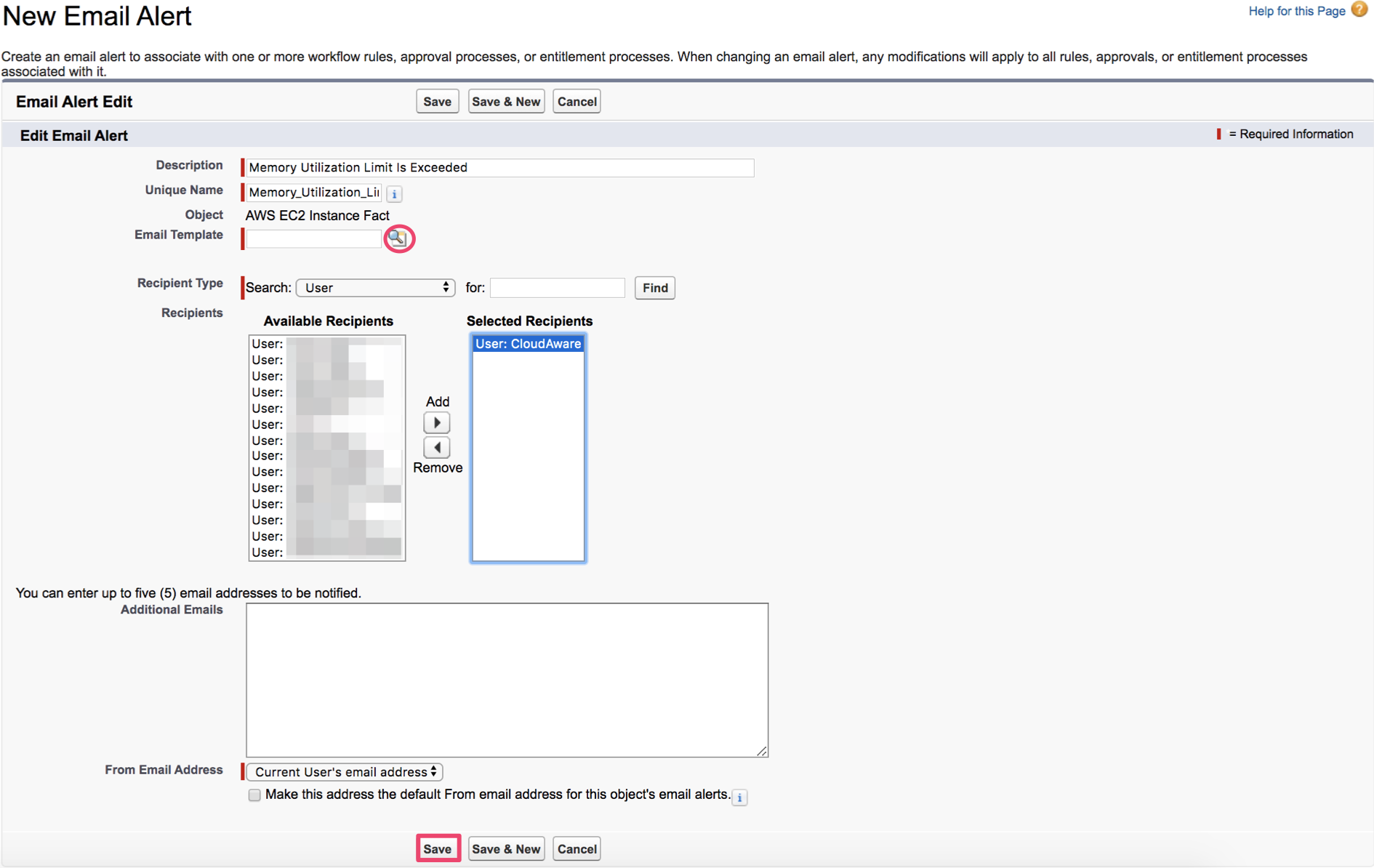 5. Select the email template and recipients who will receive notifications. Click Save.